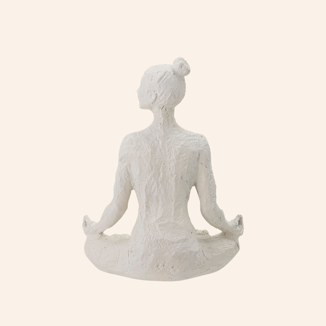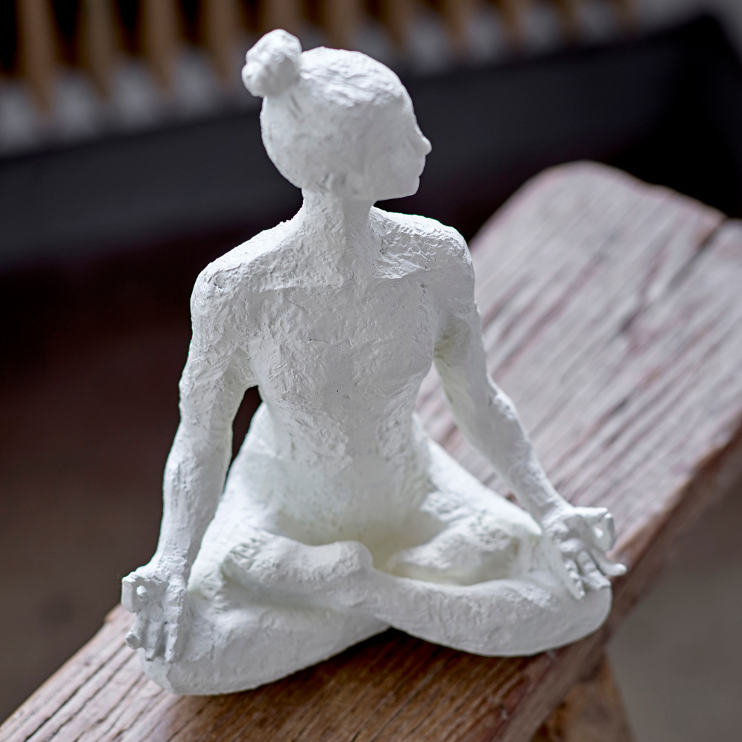 Delicada estátua de poliresina branca, que retrata uma mulher sentada de pernas cruzadas fazendo ioga.