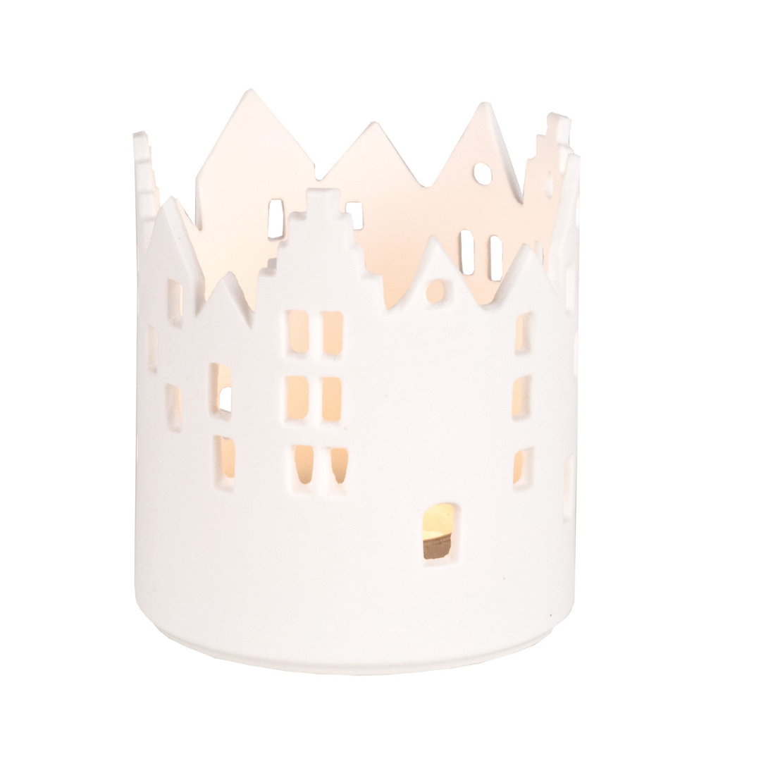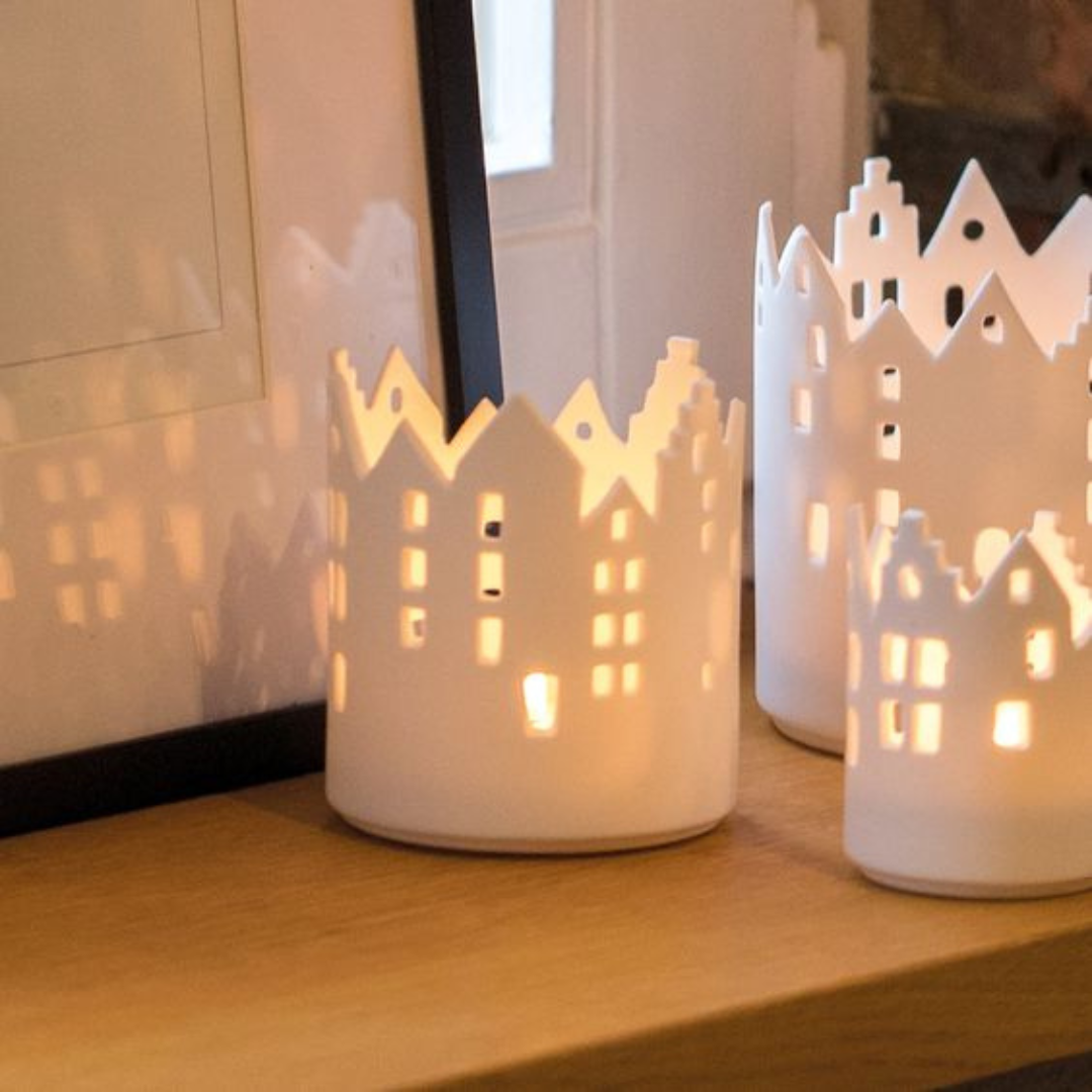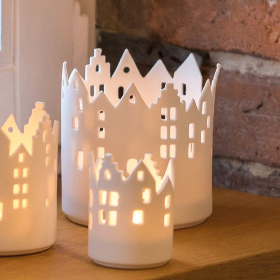 O aconchego de uma viagem por paisagens citadinas sem sair do lar, através destes suportes para velas em porcelana mate!