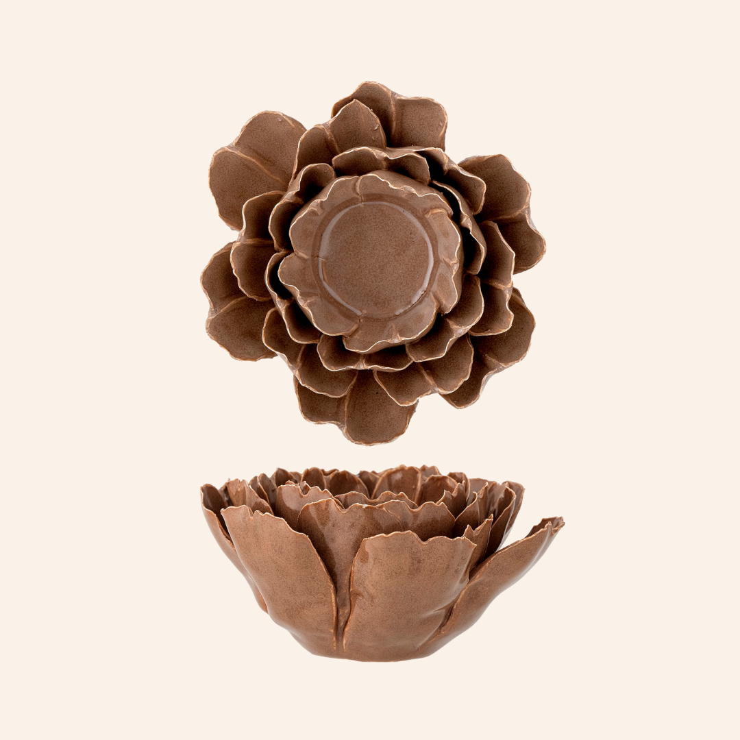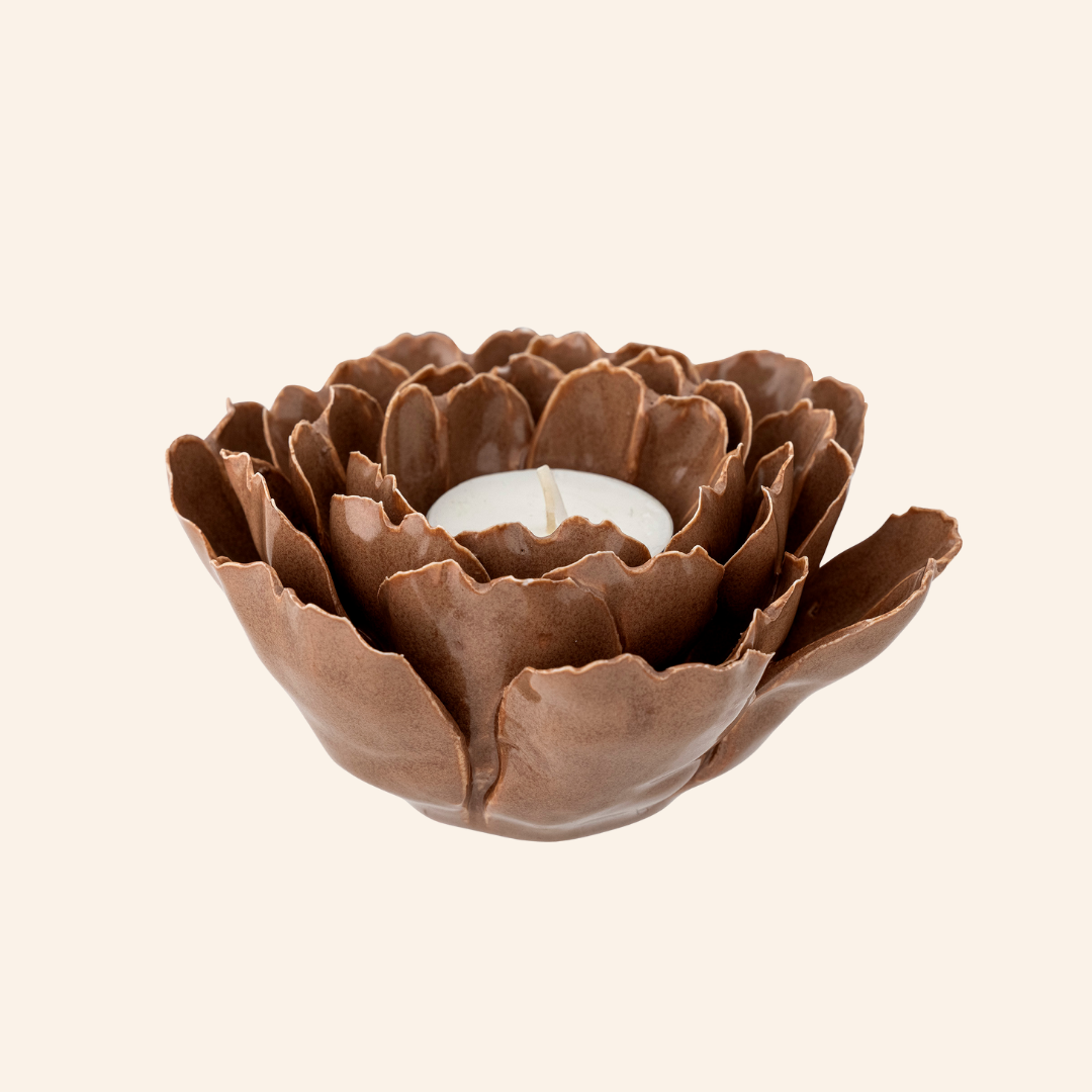 Flor decorativa e/ou porta-vela, em grés, produzida à mão, com tonalidade acastanhada.