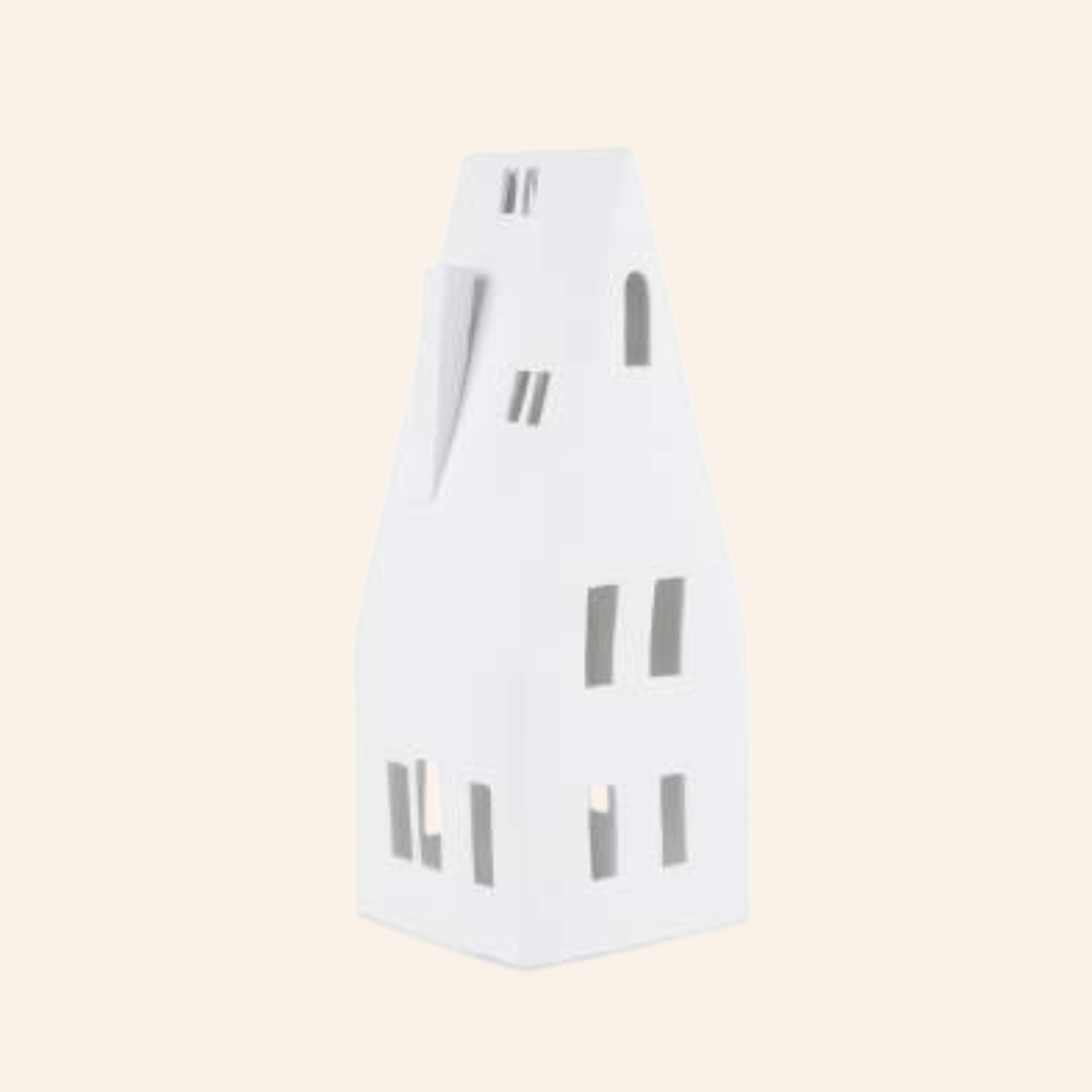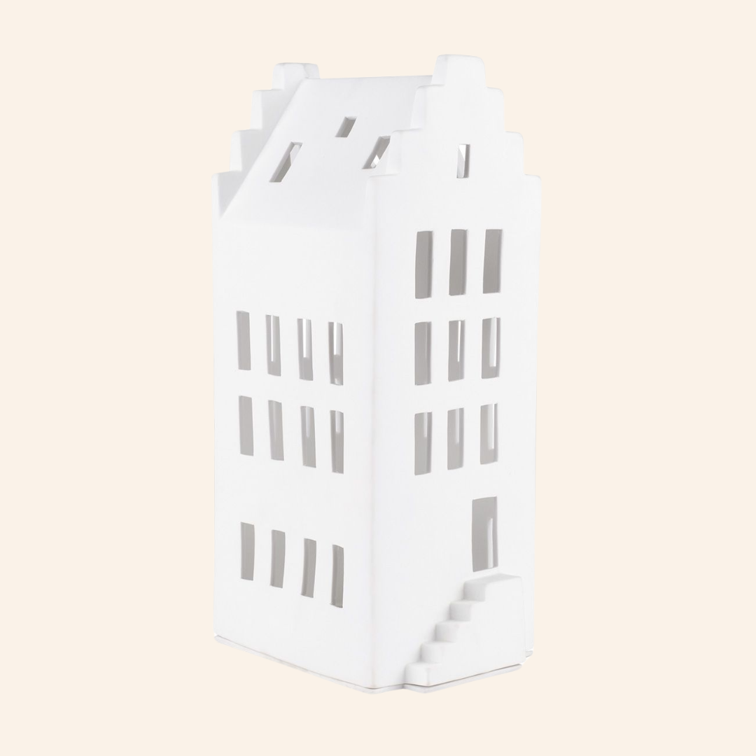 O que torna esta peça especial é a presença de janelas e portas delicadamente recortadas na porcelana fina mate, constituindo uma fonte de luz suave.
